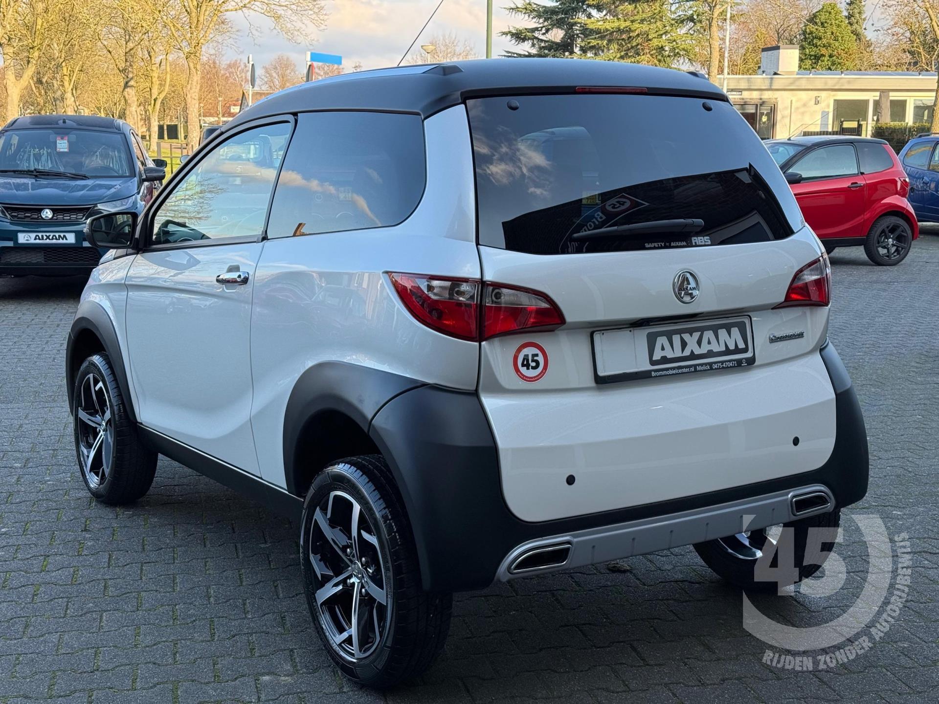 De Aixam Crossover is de grootste brommobiel op de markt. Of je nu veel boodschappen moet vervoeren, een hobby hebt met veel materiaal, of gewoon de veiligheid van een hoge zit waardeert; deze wagen biedt het allemaal. De parelmoer witte lak geeft de auto een exclusieve uitstraling die in het zonlicht pas echt tot zijn recht komt.
